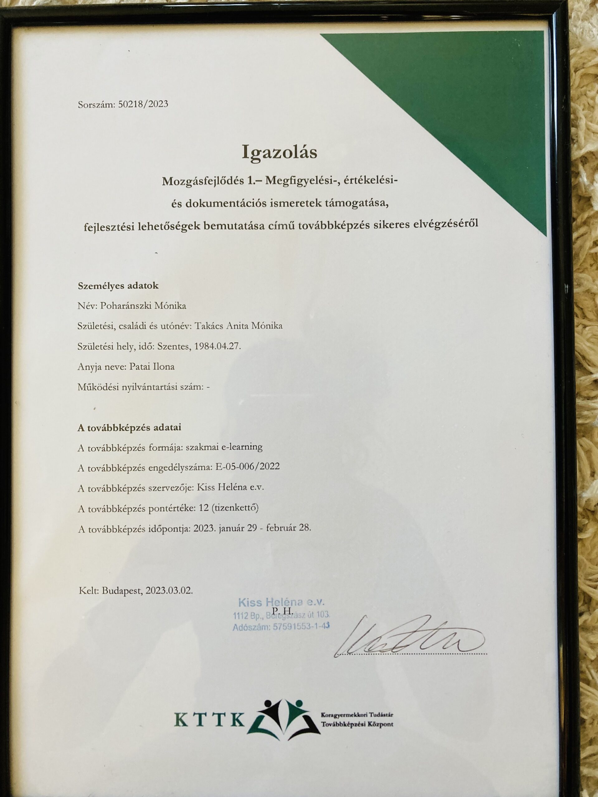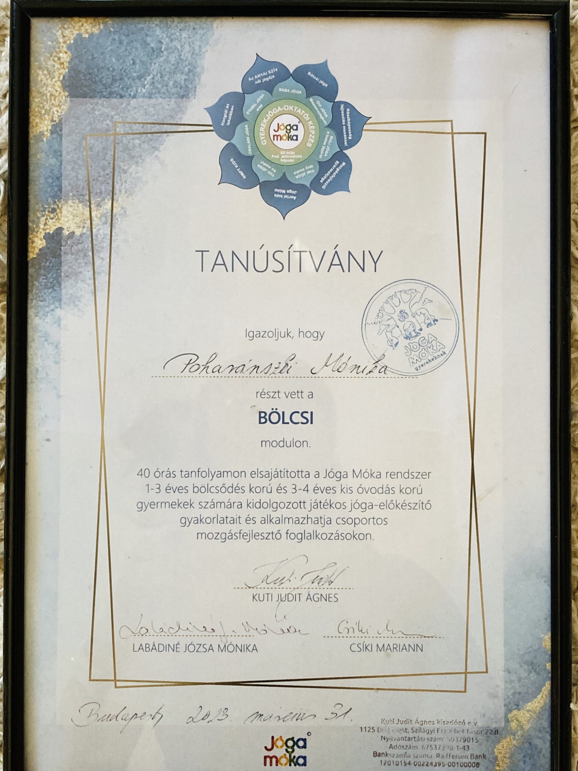 A mozgás fontosságát már a Bölcsőde megalapításánál figyelembe vettem. Hogy komolyabban foglalkozhassak a mozgásfejlesztéssel, elvégeztem a Fitnesz Instruktori képzést, ami mindennek az alapja. 2023-ban a bölcsődémben járó gyermekek fejlesztésére elvégeztem Csíki Mariannál a Jóga Móka rendszer Bölcsődei Jóga modulját, amely 1–3 éves bölcsődés, illetve 3–4 éves kis óvodás korú gyermekek számára kidolgozott játékos jóga-előkészítő gyakorlatokat tartalmaz. A szülők kérésére délutáni foglalkozások is elérhetővé váltak.