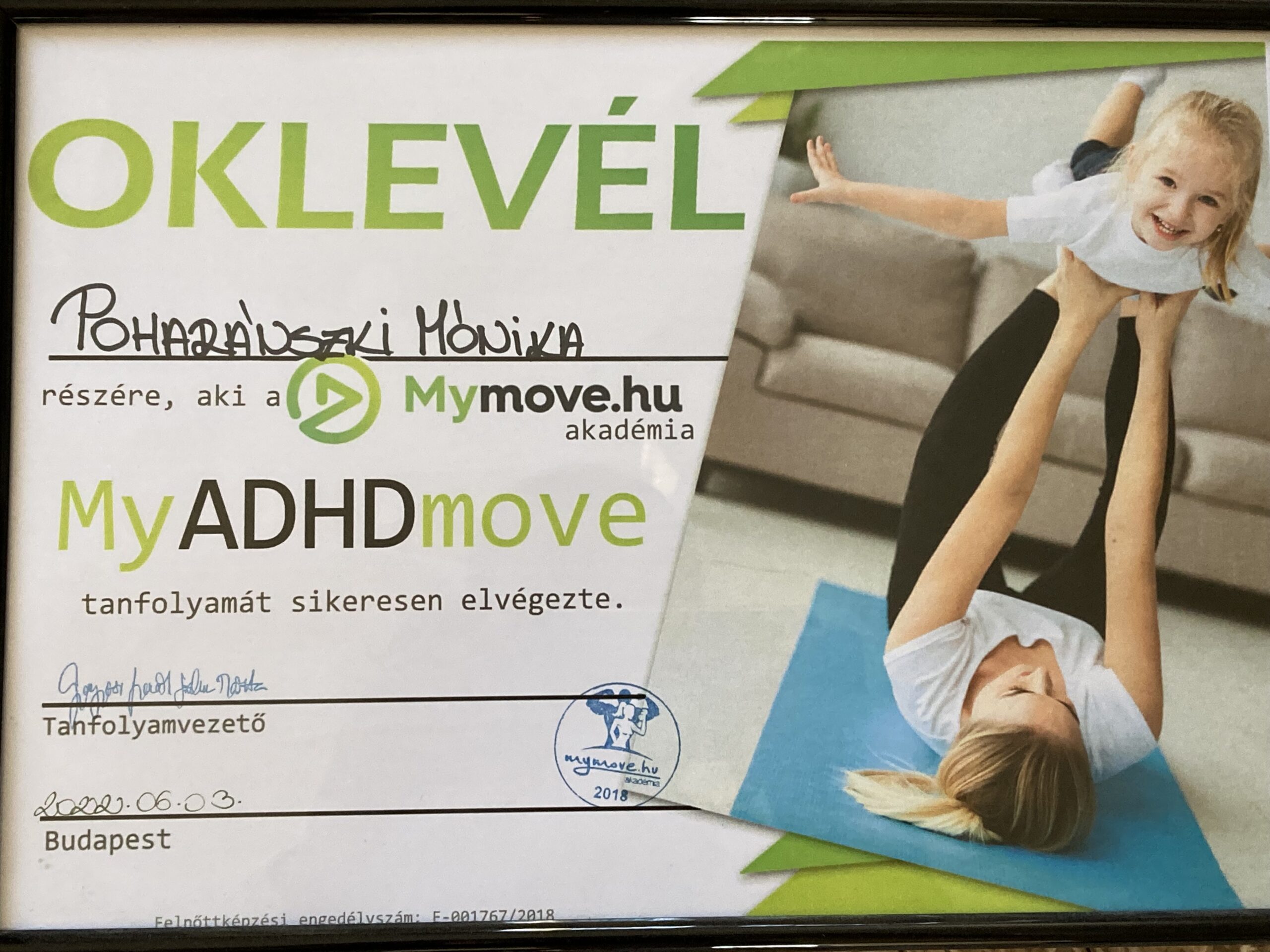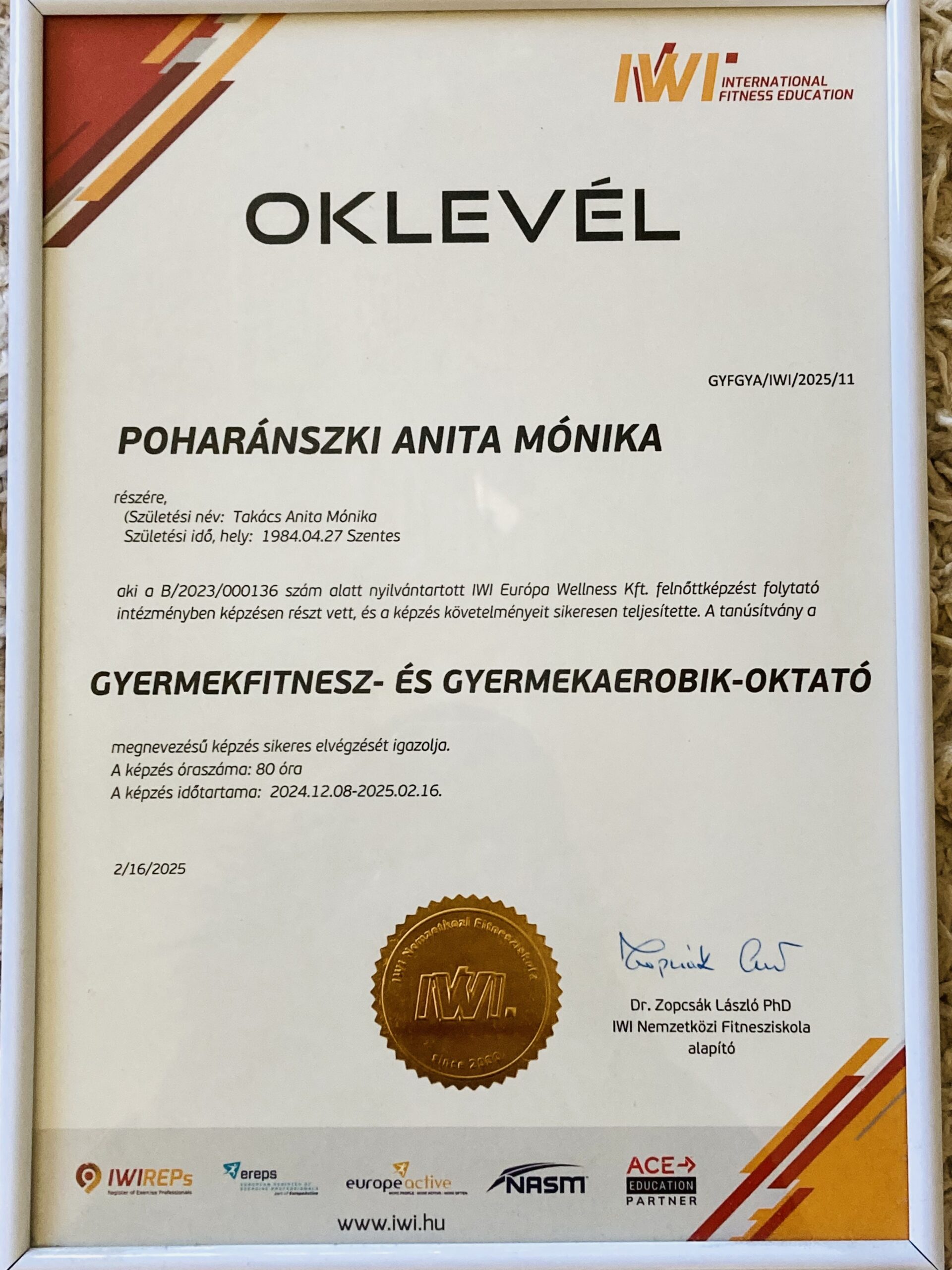 Mindenképpen szerettem volna a nagyobb gyermekeknek is segíteni a mozgásfejlesztésben – nemcsak az egészséges gyermekeknek, hanem pl. ADHD-s és autista gyermekeknek is –, ezért képesítést szereztem ADHD Move oktatásra. 2024 decemberében továbbléptem, és az IWI – Nemzetközi Fitnesziskolánál elkezdtem a Gyermekfittnesz és Gyermekaerobik Oktató tanfolyamot, hogy egészen kisiskolás (5–6. osztályos) gyerekek fejlesztését is vállalhassam.