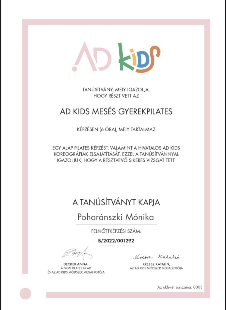 Rohanó új világban élve és látva az okos eszközök használatából eredő testi sérüléseket testtartás beli elváltozásokat, elvégeztem az AD Kids Gyermek Pilates tanfolyamot, ezt követi a Tini Pilates Decker Anna vezetésével és oktatásával. Hisz tudjuk Joseph Pilates is erre a célra fejlesztette a Pilatest, hisz gyermekkori betegségei arra ösztönözték, hogy figyeljen egészségére és fittségére.
